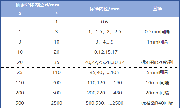 公制(zhì)軸承的内徑(d),在0.6~2500mm範(fan)圍内規定了90種标(biāo)準尺寸,如下表: